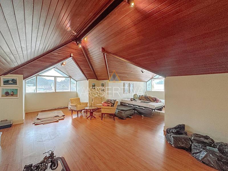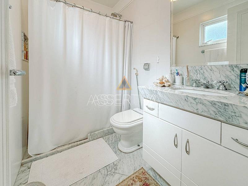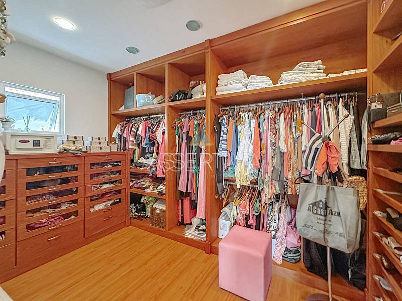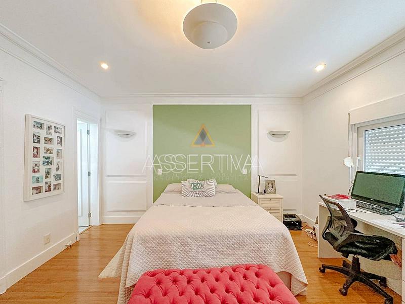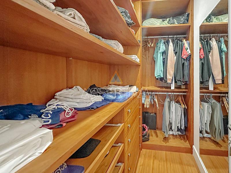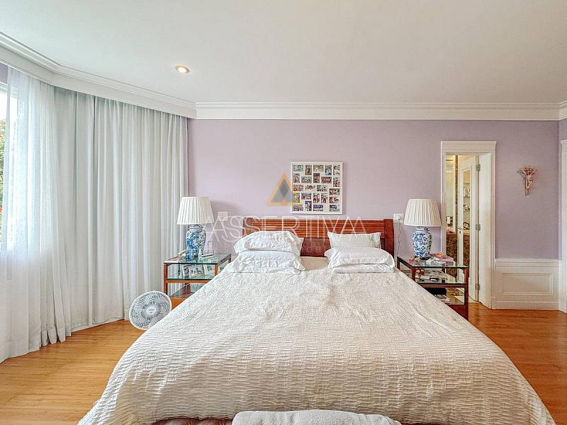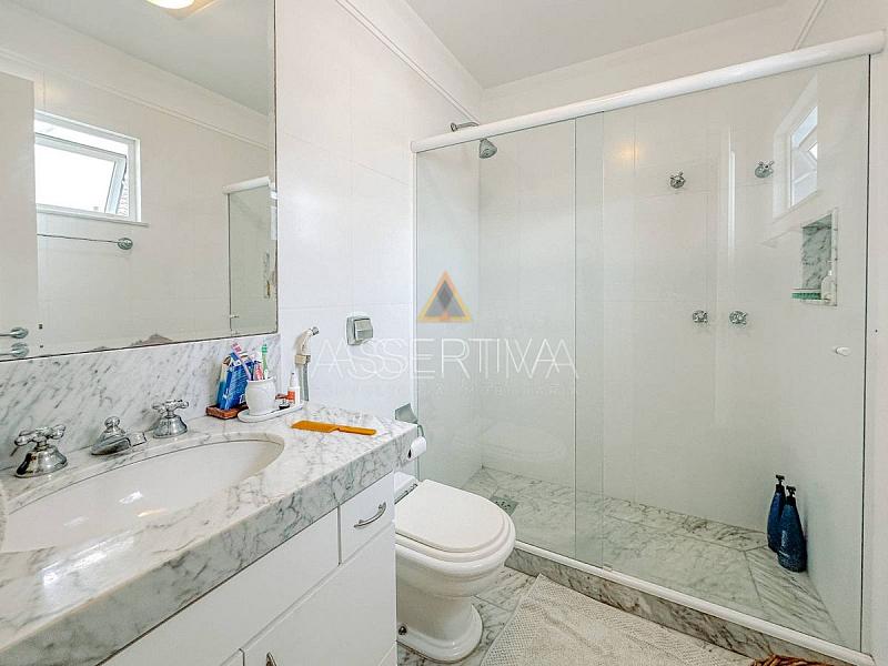 Hall íntimo, banheiro social, sala de TV, três suítes, todas com closet e a master com banheira de hidromassagem.