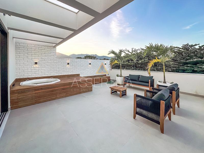 O lazer é completo: piscina com cascata, área gourmet integrada, e um terceiro pavimento com hidromassagem e uma vista livre incrível, perfeita para momentos de contemplação e relaxamento.