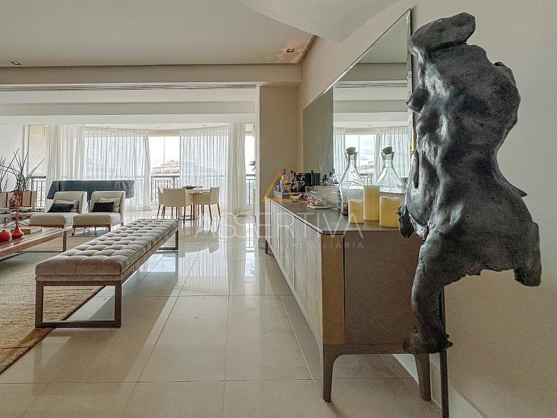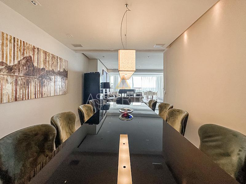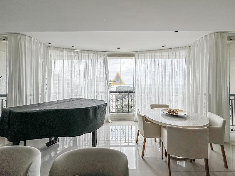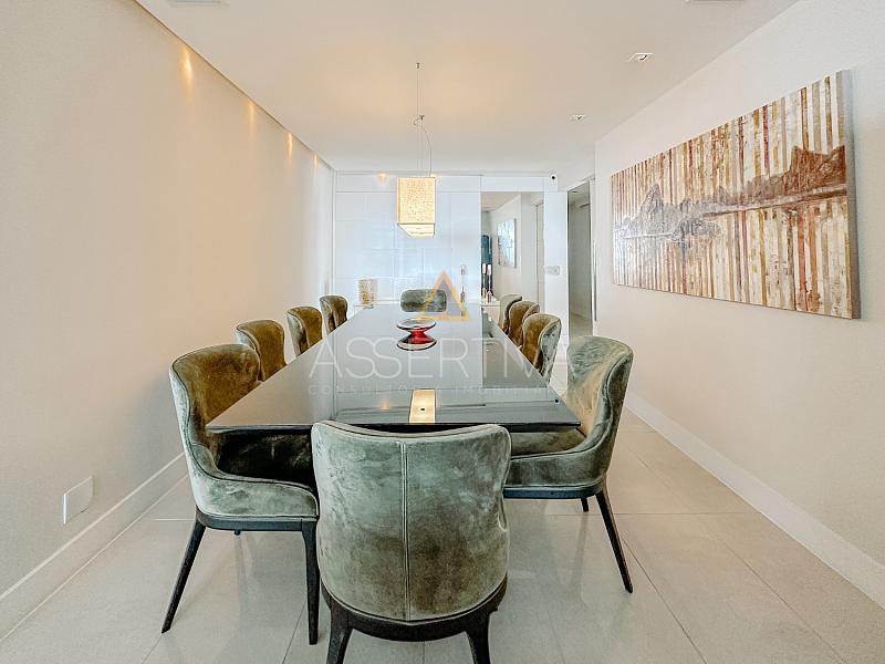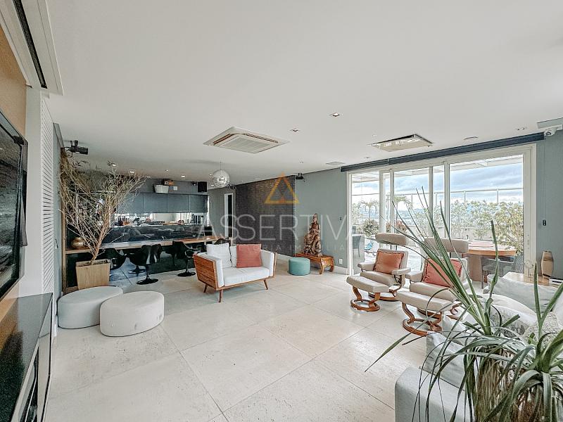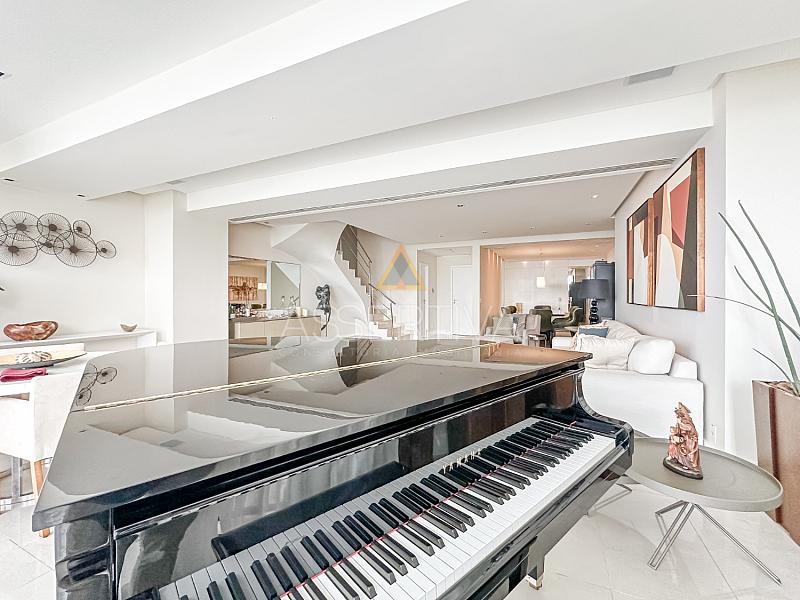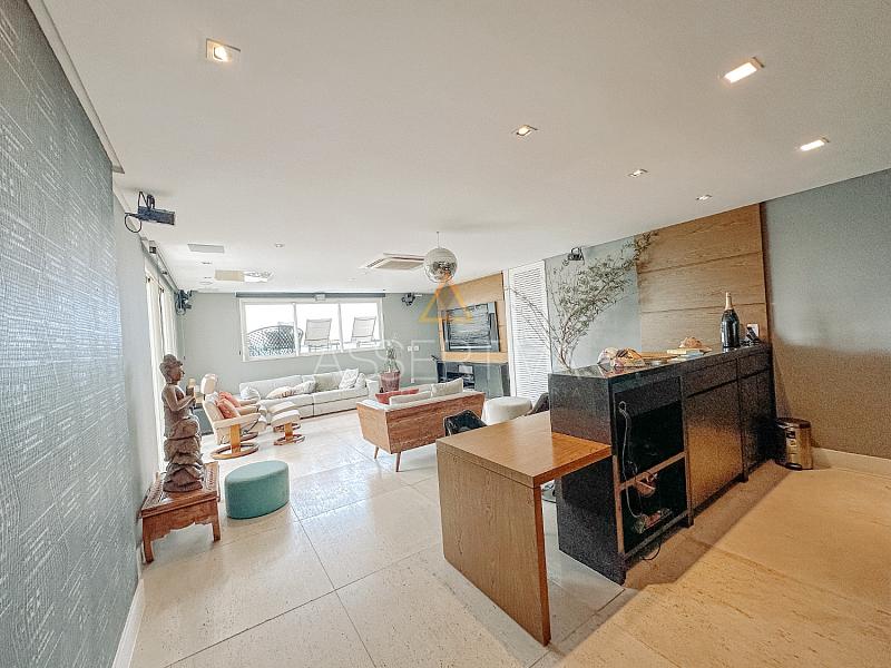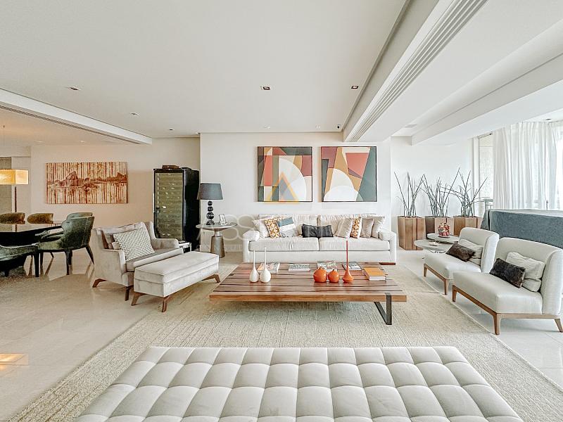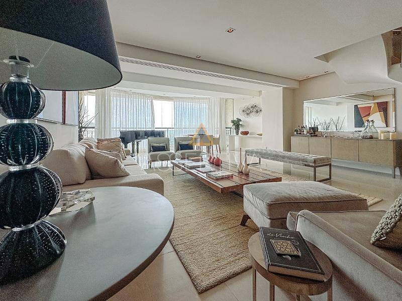 Totalmente mobiliada com móveis de altíssimo padrão, a cobertura conta com quatro suítes amplas, incluindo uma suíte master com um closet generoso e ambiente digno de hotel cinco estrelas. A área social impressiona: sala integrada em dois ambientes, cozinha com copa planejada, escritório privativo e um espaço de lazer completo.